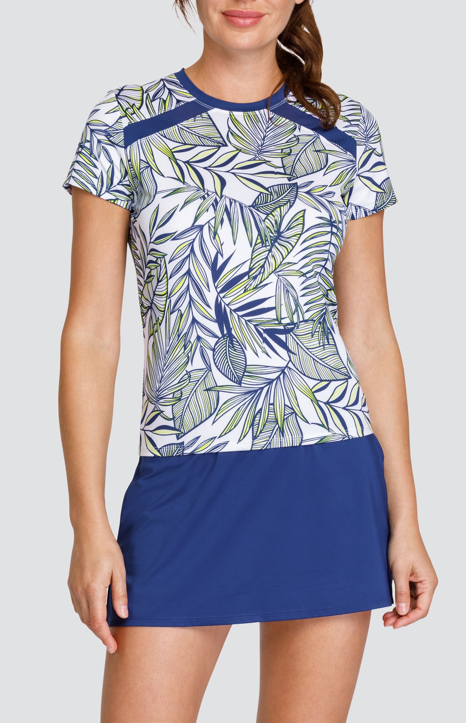 From our Serenity collection. Keep calm and play Tennis. This Fremont top is a short sleeve, crew neck top. Featuring 6.5″ sleeves with back and armhole inserts in Blue Depths.