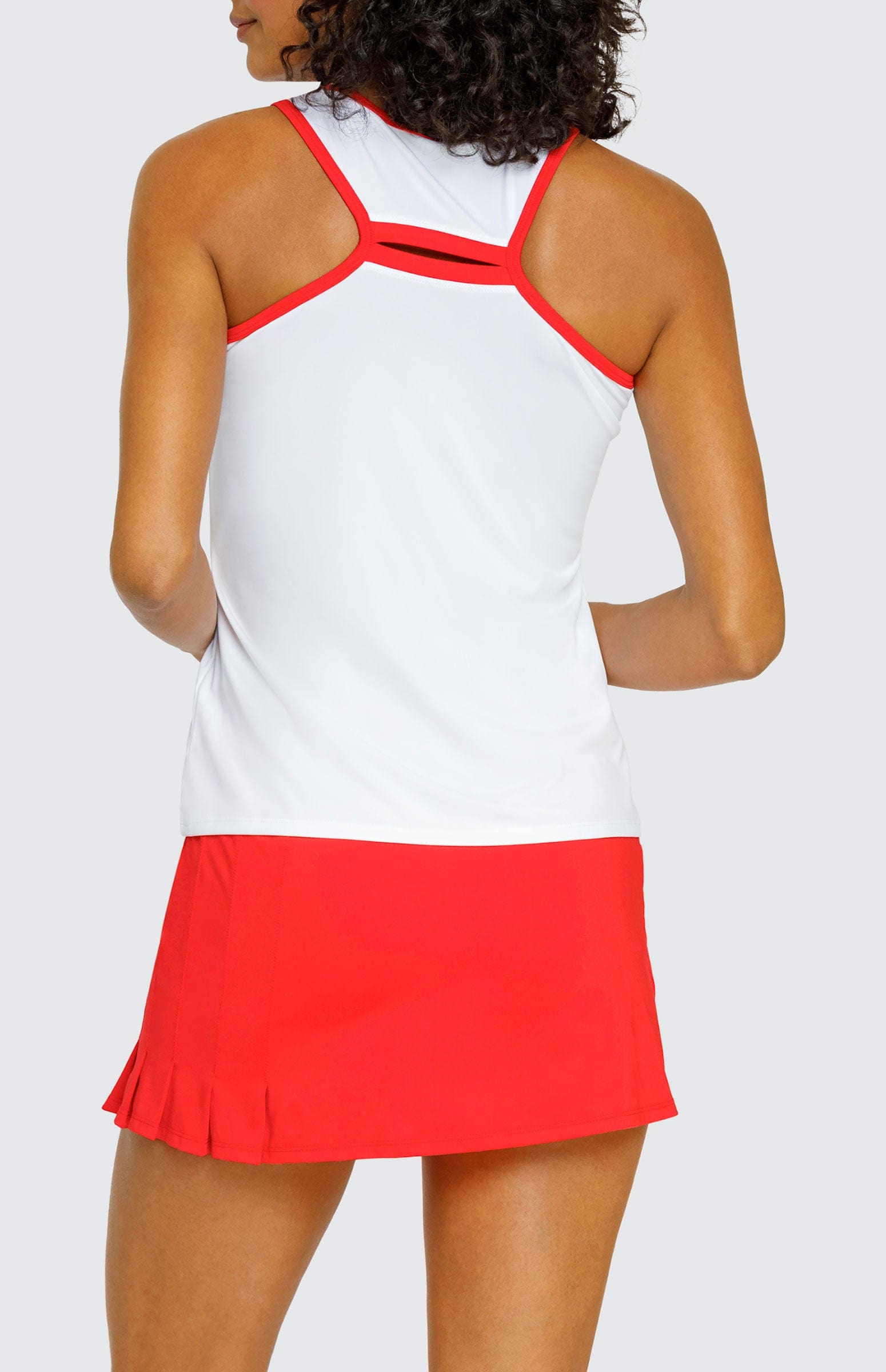 Play peek-a-boo with our Surrey racerback tank, featuring a center back cutout and striking contrast accents. Made with our wrinkle-resistant, moisture-wicking Bliss Jersey fabric, it will continue to be a staple in your wardrobe wash after wash. And the UPF 50+ protective technology that is built-in to the fabric will give you peace of mind as you play under the sun’s harmful rays.
